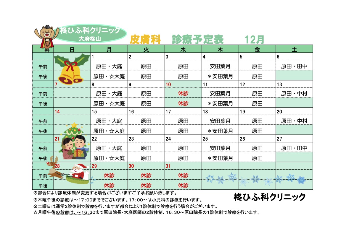 12月の診療予定表です。 ご受診の際にご参考になさってください。