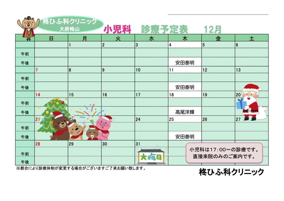 12月の診療予定表です。 ご受診の際にご参考になさってください。