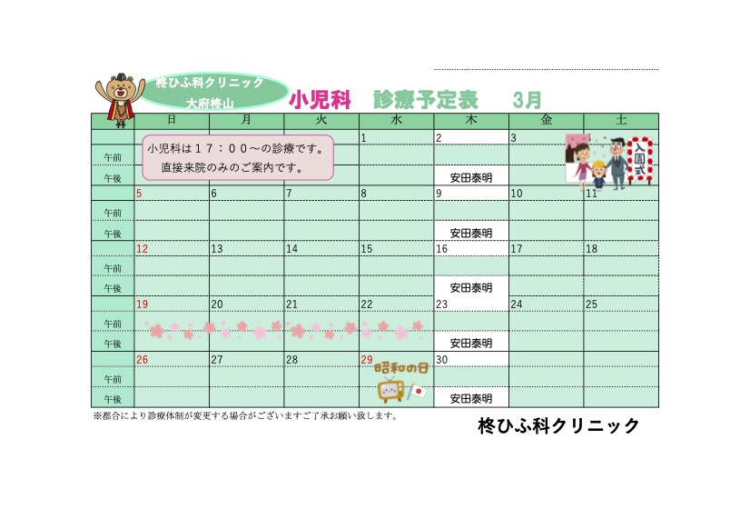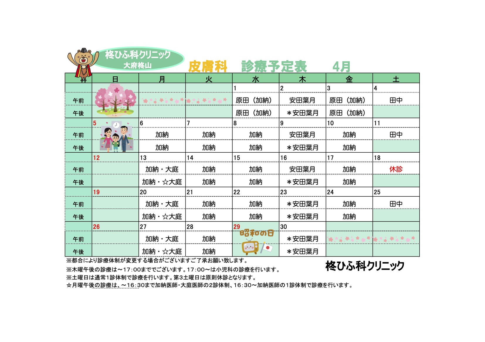 4月の診療予定表です。 ご受診の際にご参考になさってください。